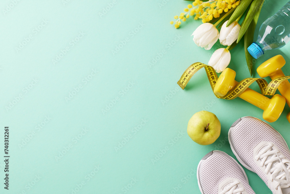 Spring into fitness: rejuvenation through movement. Top view shot of white sneakers, yellow dumbbells, apple, water, tape measure, flowers on teal background with space for advertisements