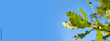 young green leaves of marsh oak against blue sky, in spring garden, summer park stretched out from strong wind, tree branches in background