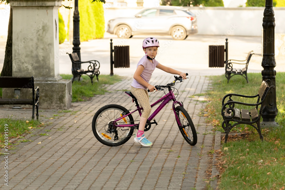 Young girl child with a safety helmet on sitting on her bike along a shaded path in the local public park with benches and greenery around. Children and physical activity, cycling, biking concept