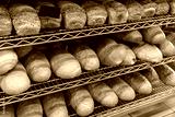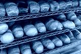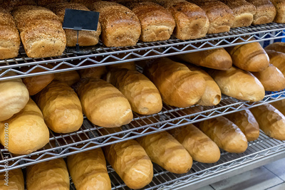 Various types of golden-brown freshly baked bread neatly arranged on metal racks, fresh bakery bread shelves, food production small business, buying selling bread simple concept, closeup, nobody