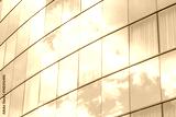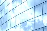 Contemporary office building with reflective glass panels that mirror blue sky and white clouds, building blending with the sky. Modern minimalistic corporate architecture, simple background texture