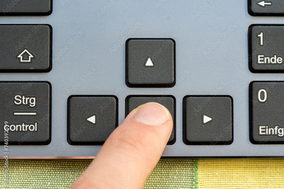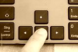 Finger pressing the back arrow key on a computer keyboard, indicating a reverse action or navigation step, going back in reverse backwards movement symbol simple abstract concept, one person, top view