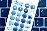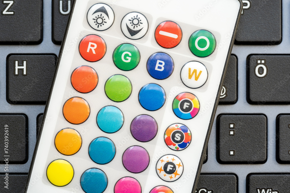 Close-up view of a colorful RGB smart home lighting system remote control with different color light buttons on top of a laptop keyboard. Smart lights devices at home, apartment concept, nobody