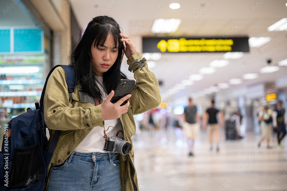A confused female is reading her flight information on her phone with a serious, doubtful face.