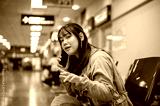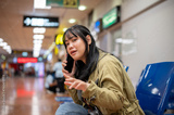 A positive Asian female traveler is talking on the phone while waiting her friend at the airport.