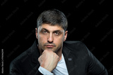 Fashion young man in black jacket over dark background