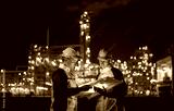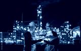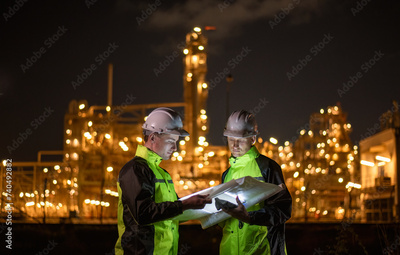 Engineer survey team wear uniform and helmet stand workplace checking blueprint project, tablet computer inspection work construction site with night lights oil refinery background.