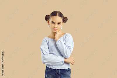 Adorable kid in casual summer outfit. Child posing on beige fashion studio background. Pretty Caucasian girl with hair buns standing with her hand on chin and looking at camera with pensive expression