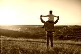 Fathers day. Back view of a little child boy sitting on his fathers shoulders holding hands and looking into the distance enjoying sunset. Father walking with son outdoors.