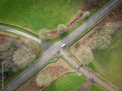 Drone top down view of a solitary car seen on an English rural road. An entrance gate can be seen which leads to a livestock farm.