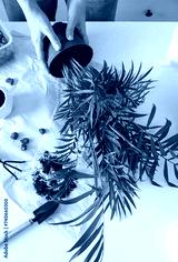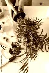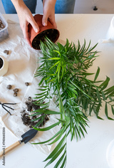 Woman is repotting chamaedorea palm plant at home. Houseplant hobby