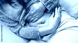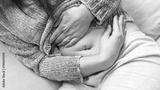 Woman with severe abdominal pain lying on the couch due to health problems related to menstruation, Crohn's disease, gastroenteritis, indegestion, cramps that cause stomach pain
