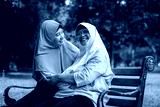 Muslim careful caregiver or nurse taking care of the patient in the hospital park. Happy Muslim mother in hijab hugging daughter. Concept of Savings and Senior Health Insurance, a Happy Family