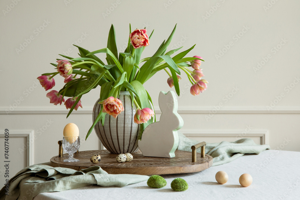 Interior design of easter dining room with colorful easter eggs, easter bunny sculptures, vase with tulips, wooden trace, beige wall with stucco, gray hen and personal accessories. Home decor Template