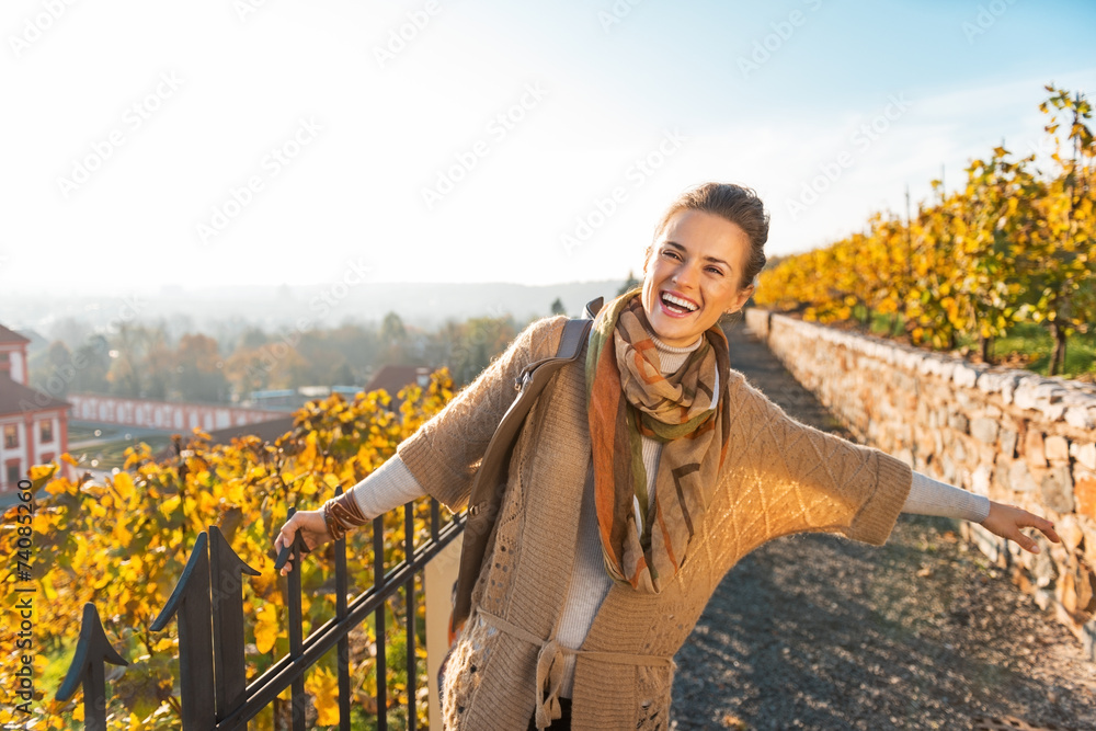 Portrait of happy young woman in autumn outdoors