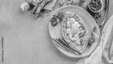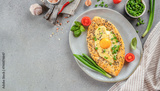 Khachapuri with egg on light background. Georgian cuisine. top view. copy space for text