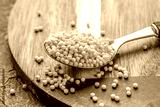 fregola pasta on spoon on wooden background top view. copy space