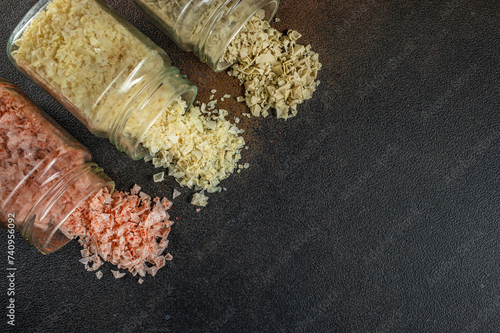 collection of different types of salt on a dark background. Long banner format. top view. copy space for text