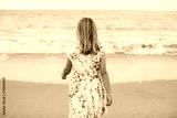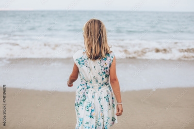 young girl looking out at the ocean walking on the coastline and wearing a blue floral dress