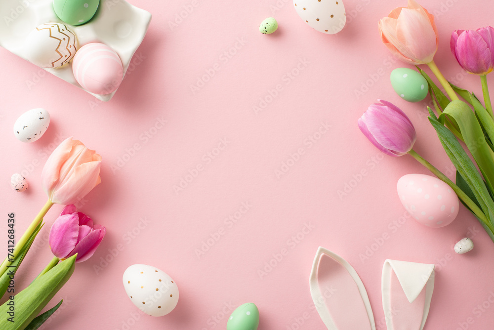 Spring Celebration Theme: top view vibrant eggs holder, adorable bunny ears, blooming tulips create festive scene on soft pastel background. Perfect for Easter greetings with frame for your text or ad