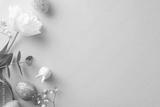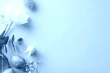 Easter motif visual with top view of slate greyish eggs, a small bunny sculpture, gypsophila, tulip, and eucalyptus branch set against a pastel blue canvas, leaving space for words