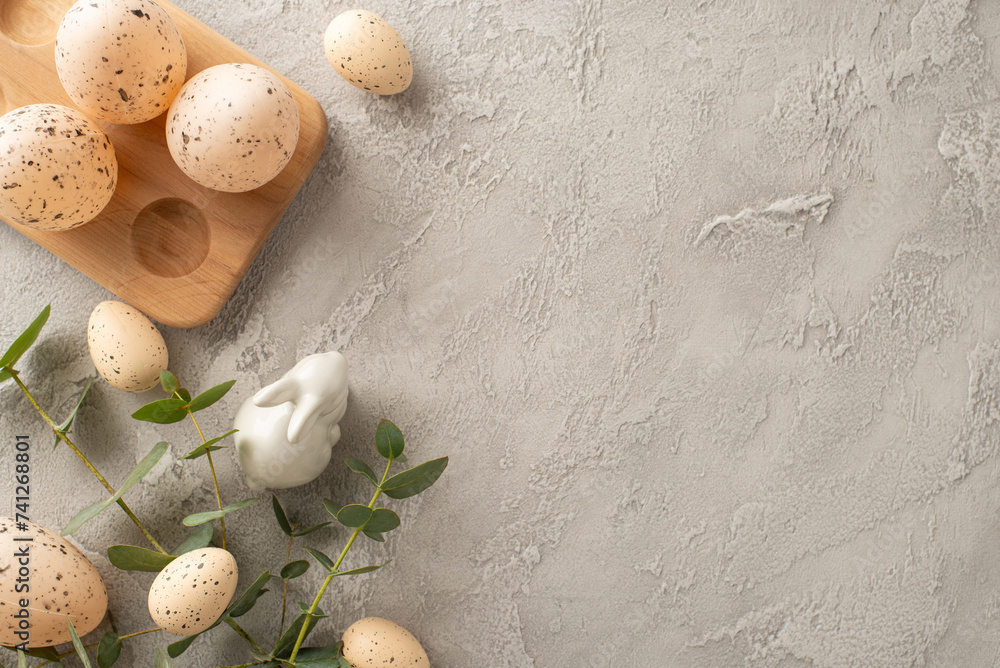 Elegant Easter top view setup with pastel-colored eggs in a rustic wooden box, a delicate ceramic rabbit, and fresh eucalyptus on a rough grey concrete backdrop, leaving space for text