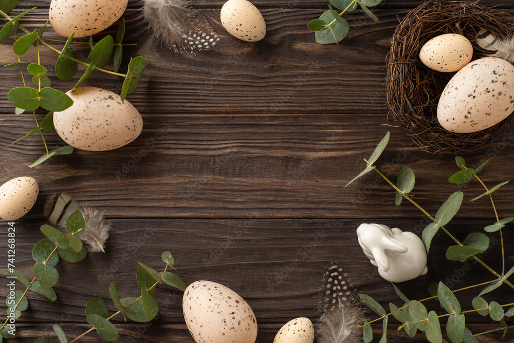 Trendy eco Easter concept. Top view of pale eggs, slender quail feathers, a nest, a stoneware rabbit, and eucalyptus branches spread on a wooden plank, with space for text or advertisements