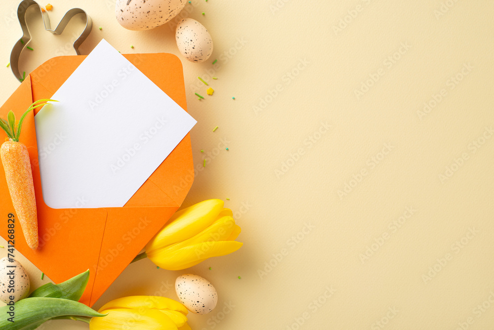 Easter preparation in full swing: top-view photo featuring a bunny note, eggs, baking shape, bunny carrot, sweet sprinkles, tulips, all set against gentle beige background with space for your message