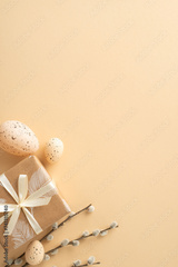 Rustic Easter collection idea. Vertical top view of eco-chic gift bundles, quail eggs, pussy willow twigs, all composed on a pastel beige ground with space for editorial content