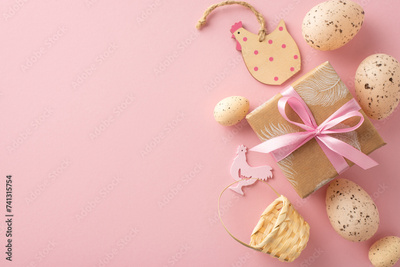 Homely Easter composition inspiration. Top-view photo of recycled paper parcel, wooden chicken decorations, patterned quail eggs, and tiny basket, organized on light pink canvas with area for wording