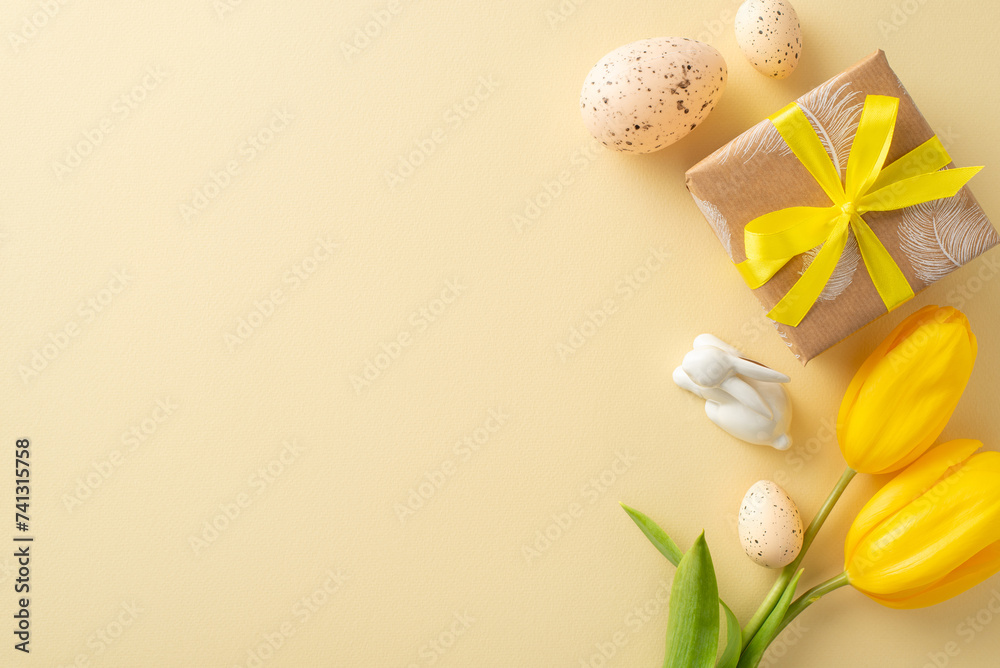 Easter top view composition with craft paper gift box, yellow tulips, bunny decor, and eggs on pastel beige background, great for festive promotions or greetings