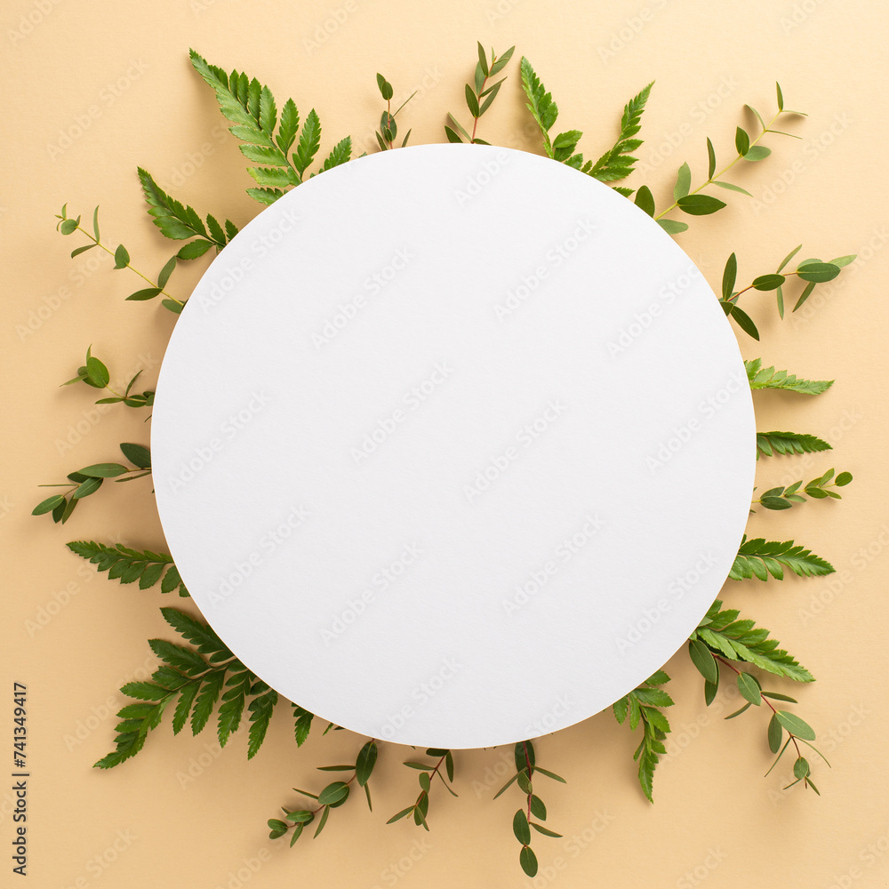 Simple natural beauty concept. High angle view square picture of empty circle surrounded by eucalyptus and bracken branches on isolated beige background with copy-space