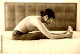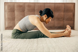 Side view of a japanese middle aged woman practicing yoga in bedroom.