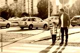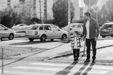 A careful dad is holding hands with his son and looking around while crossing a street.