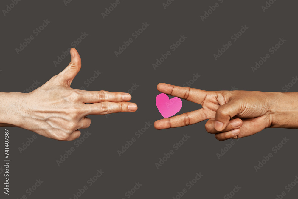 Stop War with Love, Peace Concept. Love always Win. a Finger Gun Gesture on left, right is a Victory Peace Hand Sign with Heart shape.World International Peace Day