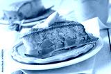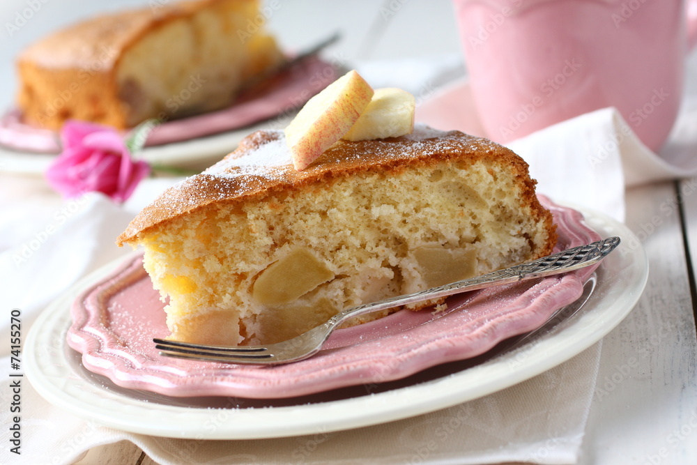 Slice of homemade apple sponge cake on pink plate