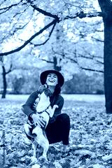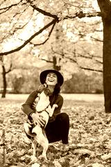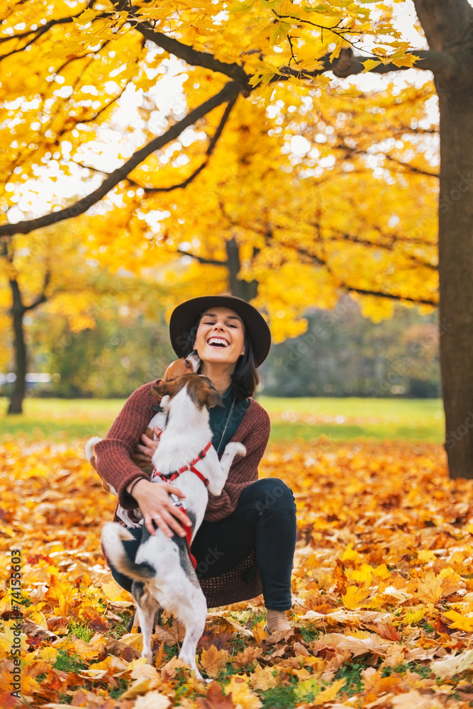 Happy young woman playing with dog outdoors in autumn