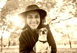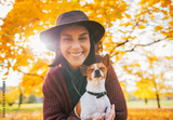 Portrait of happy young woman with dog outdoors in autumn