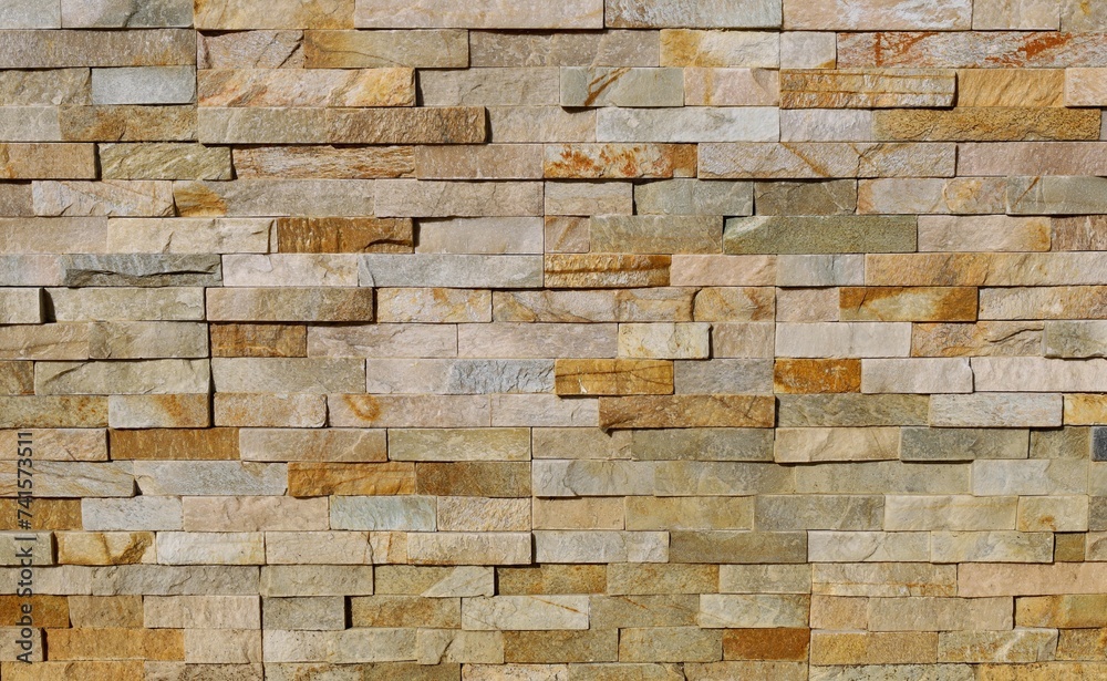 Stone cladding wall made of striped stacked bricks of natural multicolor rocks. Panels for exterior, background and texture.