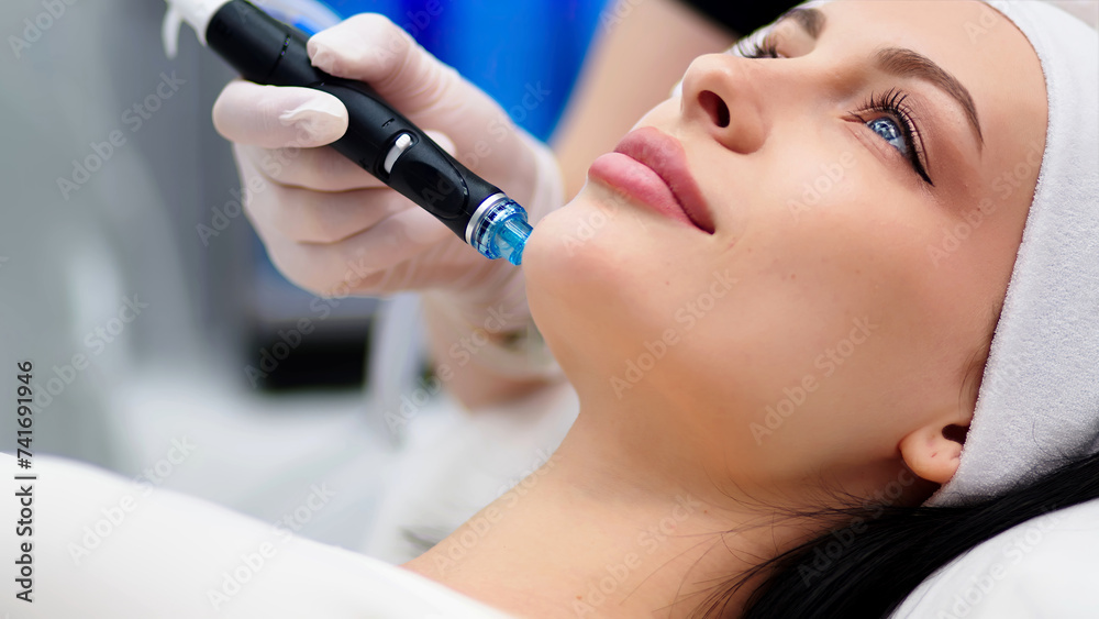 Anti-aging care, skin care, facial cleansing. A cosmetologist does a hydrofacial procedure on a woman's face in a beauty clinic.