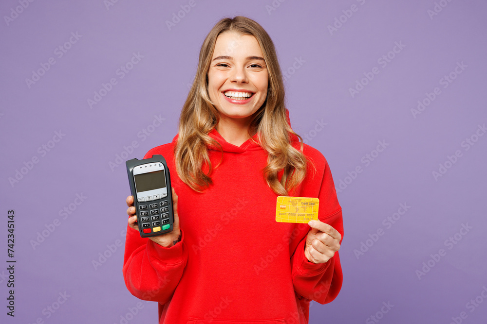 Young woman wears red hoody casual clothes hold wireless modern bank payment terminal process acquire credit card isolated on plain pastel light purple background studio portrait. Lifestyle concept.