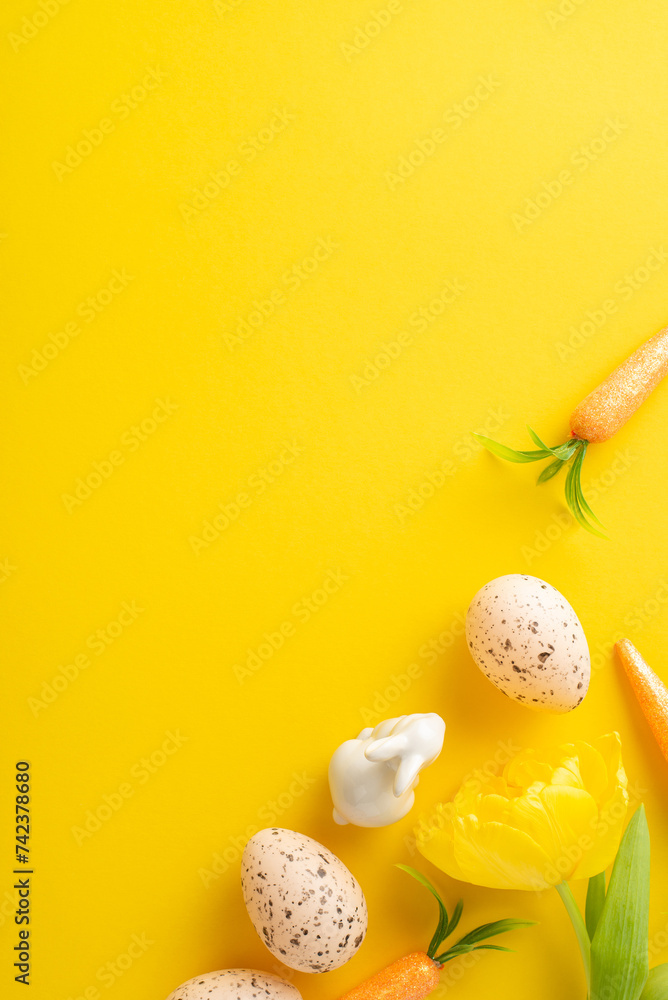 Springtime Easter charm. Top view vertical picture of eggs, carrots for the bunny, and tulip on a lively yellow canvas with space for text or advertising