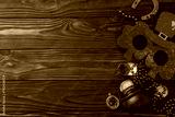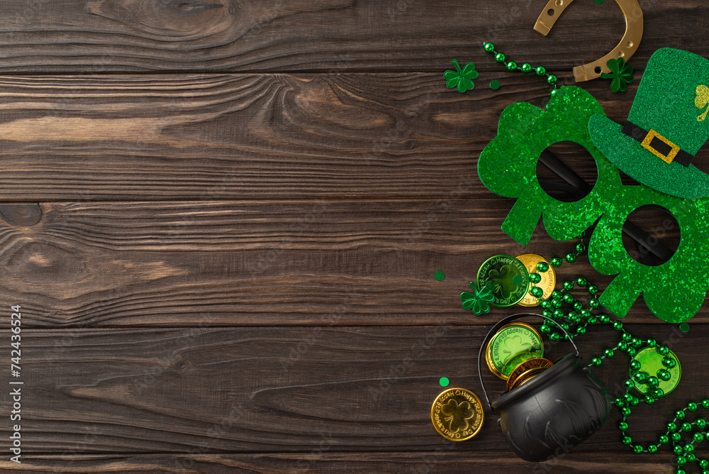 Delightful St. Patrick's composition seen from top view, consisting of clovers, pot with fortune coins, costume glasses, horseshoe, beads neatly placed on wood ground, leaving space for publicity