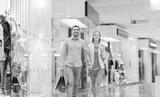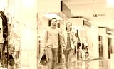 happy young couple with shopping bags in mall