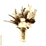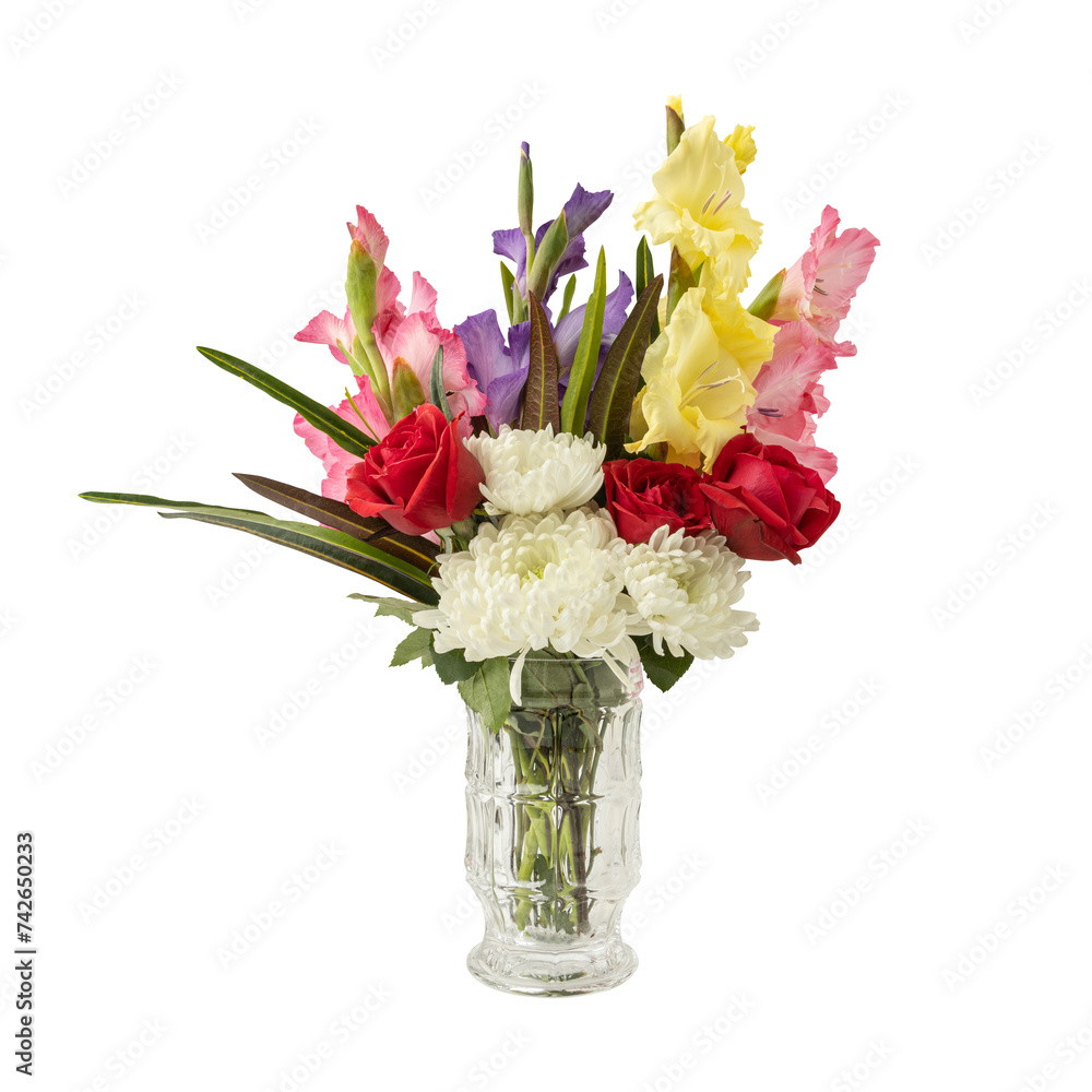 Bouquet of mixed flowers and leaves in vase isolated on transparent background