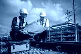 Engineer under inspection and checking construction process railway switch and checking work on railroad station .Engineer wearing safety uniform and safety helmet in work.