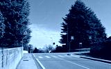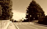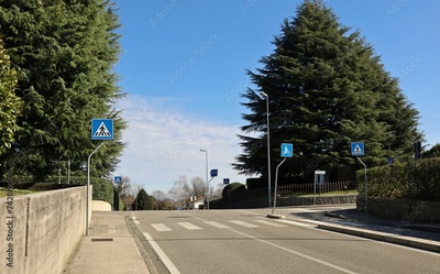 Pedestrian crossing signs and bicycle lane signs along a road in a suburban area. Background and texture