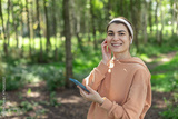 Happy young woman in sport wear with wireless headphones and smart phone in the park. Sport activity lifestyle