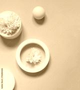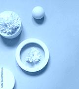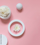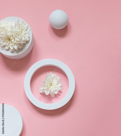White round geometrical shapes with white chrysanthemum flowers on the pink background. Top view. Floral abstract composition