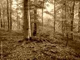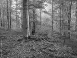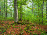 Natural Foggy Forest of old Beech Trees with moss covered roots